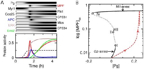 Figure 2. Complex bistable dynamics during meiotic maturation.(A) Time courses of various protein concentrations in response to a lasting progesterone pulse. We use the parameter set given by Table 2. In the top panel, time profiles are represented using a grayscale code which is normalized so that the maximal concentration of each protein corresponds to black. In the bottom panel, activities of MPF (red), ERK (brown), APC (blue) and Emi2 (green) are shown as functions of time, together with the constant progesterone signal (dashed line). (B) Bifurcation diagram showing the steady state of MPF activity as a function of progesterone level. Black solid and dotted lines are associated with stable and unstable equilibria, respectively. Circles indicates the occurence of a saddle-node bifurcation. The red dashed line shows the dynamic trajectory of MPF during progesterone-induced maturation.