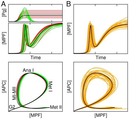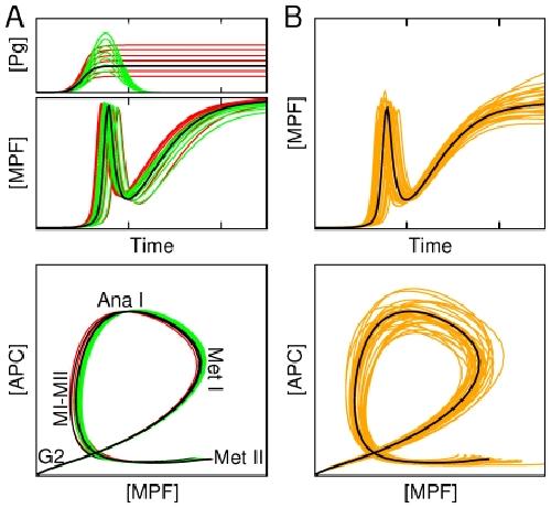 Figure 3. Robustness of meiotic dynamics to signal and kinetic parameter variability.Dynamical trajectories of [MPF] followed in time (top panels), and in state space ([MPF],[APC]) (bottom panels) during maturation in presence of two types of random variability. (A) Variations of progesterone input profile (green lines: pulse-like; red lines: step-like) and amplitude. (B) Variations of all kinetic parameter values with a (orange lines). Thick black lines correspond to the control case depicted in Fig. 2. In bottom panel of (A) is indicated the maturation stage (MetI: metaphase of meiosis I, AnaI: anaphase of meiosis I; MI-MII: transition from meiosis I to meiosis II; MetII: metaphase of meisosis II) associated with distinct portion of the state-space trajectory.