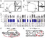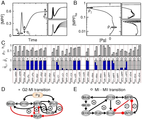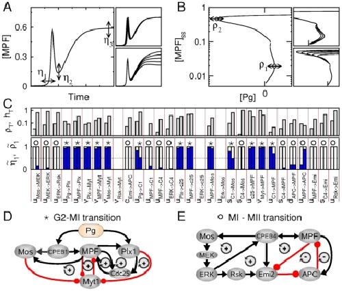 Figure 4. Identification of two network modules using parameter sensitivity analysis.(A) Schematic representation of the first sensitivity measure, where , and correspond to variations in timing of first MPF peak and in MPF levels at the MI/MII transition and at the metaphase II arrest, respectively, in response to parameter variations. Right-side panels show two examples where only or indicators is sensitive to the parameter changed. (B) Schematic representation of the second sensitivity measure, where and correspond to displacements of saddle points I and IV in the bifurcation diagram of Fig. 2B, in response to parameter variations. Right-side panels show two examples in which only one saddle-node bifurcation point is sensitive to the parameter changed. (C) Systematic calculation of normalized sensitivities for all interaction parameters of the model (see Eqs.1 and 2 with , , , and ). The top panel shows the total sensitivities and . The bottom panel shows the normalized sensitivities (left bar) and (right bar). Asterisks (resp., circles) indicate when (resp., ). (D,E) The initial network can be redrawn as two networks that control different stages of maturation process, namely the G2/MI and MI/MII transitions. The and signs indicate the presence of positive and negative feedback loops, respectively.