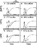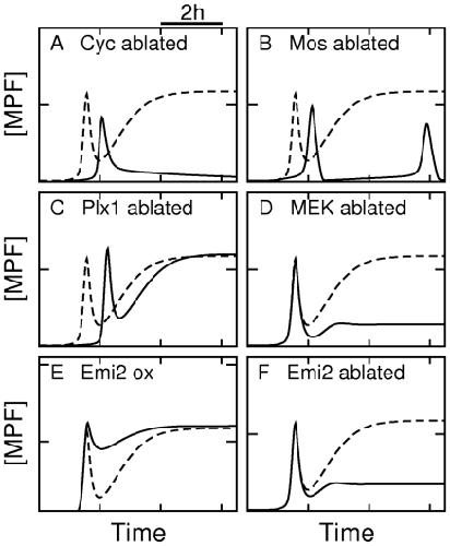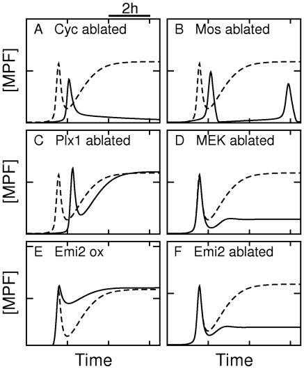 Figure 5. Simulated MPF time courses associated with meiotic maturation defects.Time course of MPF activity in normal condition (dashed line) and various altered conditions (full line). (A) Ablation of cyclin synthesis (). (B) Ablation of Mos synthesis (). (C) Ablation of Plx1 activity . (D) Ablation of MEK activity (). (E) Overexpression of Emi2 (). (F) Ablation of Emi2 synthesis ().