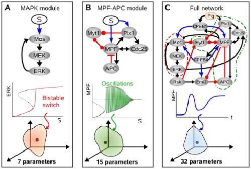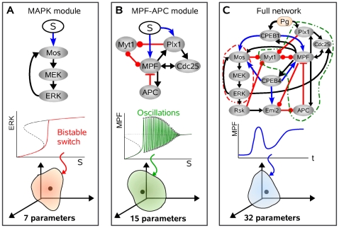 Figure 7. Strategy for the adjustment of model parameters.(A) The constraint that the MAPK module (upper panel) must behave as a bistable switch (example of a bifurcation diagram in middle panel) allows one to determine a parameter domain in a 7-dimensional parameter space (bottom panel). An arbitrary parameter set is chosen within this domain. (B) The constraint that the MPF-APC module (upper panel) must behave as an oscillator under constant stimulation or be excitable upon a transient stimulation, which is associated with a saddle-node bifurcation on an invariant circle (example of a bifurcation diagram in middle panel), allows one to determine a parameter domain in a 15-dimensional parameter space (bottom panel). An arbitrary parameter set is chosen within this domain. (C) The constraint that the whole network (upper panel) must display a maturation behavior associated with a specific time course of its components (MPF time course as an example in middle panel) allows one to determine a parameter domain in the remaining 32-dimensional parameter space (bottom panel). An arbitrary parameter set is chosen within this domain.