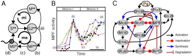 Figure 1. Temporal and structural organization of oocyte meiotic maturation.(A) State transitions during mitotic cycles (mi) and meiotic maturation (me). Haploid and diploid states are indicated by one or two asterisks, respectively. The four main stages of meiosis are (a) meiotic resumption following the progesterone pulse, (b) metaphase of the first meiosis, (c) meiotic transition and (d) metaphase arrest during the second meiosis. (B) The typical time course of MPF kinase activity during the maturation process of Xenopus oocytes where the four main stages (a–d) are indicated. Experimental data are from [54] (black circles), [7] (orange diamonds), [6] (blue triangles), [55] (magenta plus), [22] (green asterisks) and [13] (red squares). The zeroes of the time axis have been calibrated and the MPF axis have been normalized to have the first peak of MPF activy occur at the same time and with the same amplitude for each time course. (C) Detailed representation of the network of translational and post-translational interactions regulating metazoan oocyte maturation. This network involves a tight and precise coupling between the MPF and MAPK pathways at multiple levels. See text for details.