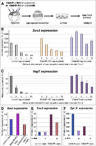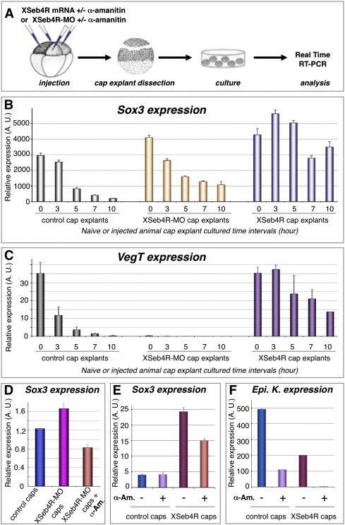 Fig. 4. XSeb4R stabilizes maternal Sox3 mRNAs in ectodermal explants. Capped-XSeb4R mRNA and XSeb4R-MO were injected alone or in combination with α-amanitin into the four animal blastomeres of 4/8-cell stage embryos. The latter were cultured together with control uninjected embryos to blastula stage. Cap explants were dissected and cultured (A) at different time points as indicated and an average of 50 caps was collected per batch for mRNA analysis. The real-time RT-PCR results reveal significant increase of Sox3 (B) and VegT (C) mRNA in XSeb4R-overexpressing caps. Note increased levels of Sox3 but not VegT mRNA in XSeb4R-MO samples (B and C, yellow bars). This increase of Sox3 mRNA levels was lost upon α-amanitin treatment (D). Alpha-amanitin treated cap explants were compared to naive or XSeb4R-overexpressing cap samples (EâF). Note the unchange levels of Sox3 mRNA (E), unlike Epi. K. (F), in treated and untreated cap explants. In XSeb4R-injected caps, the levels of Sox3 mRNA, but not Epi. K., reamined significantly high compared to the control untreated naive caps (E and F). The RNA quantification was done in duplicate or triplicate and the standard deviation is added to the histogrammes. Data are expressed relative to GAPDH mRNA. Note a use of different scales in graphics from panels B to F.
