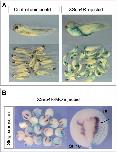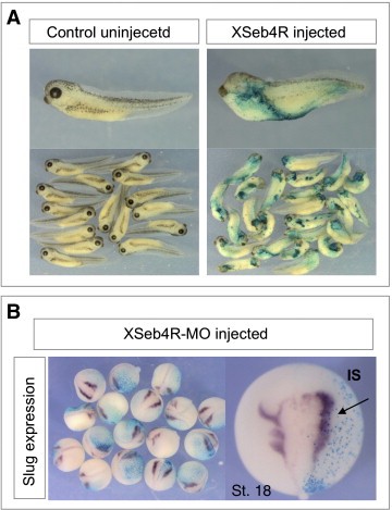 Fig. S2. XSeb4R gain- and loss-of-function in the embryos. Pigmented and albino embryos were unilaterally injecetd with XSeb4R capped-RNA (200 pg/blastomere) or XSeb4R-MO (20 ng/blastomere), using LacZ mRNA as a tracer (200 pg/blastomere). Embryos were cultured and fixed at neurula stage 18 and at tadpole stage. X-gal staining were performed (blue color) and the albino embryos were analyzed by WMISH. Note differential distribution of the blue color, recapitulating the sites of XSeb4R overexpression (A) or depletion (B). Neural crest (NC) formation was investigated targeting Slug expression (B). XSeb4R-MO revealed no significant effect on the intensity of Slug expression but rather a marked clustering of signal that reflects NC cells migration inhibition (100%, n = 32).