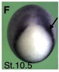 rbm38 ( RNA binding motif protein 38) gene expression in Xenopus laevis embryo, assayed via in situ hybridization, NF stage 13, dorsal view, posterior up.