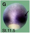 rbm38 ( RNA binding motif protein 38) gene expression in Xenopus laevis embryo, assayed via in situ hybridization, NF stage 11.5, dorsal view, animal hemisphere up.
