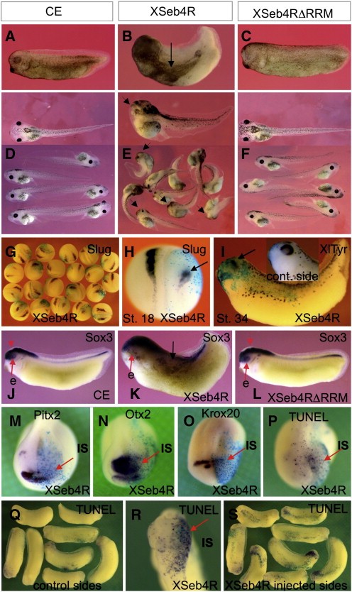 Fig. 2. XSeb4R overexpression blocks anteriorâposterior (AâP) patterning and activates apoptosis, leading to loss of head structures. Pigmented Xenopus embryos were injected with 200 pg of XSeb4R or XSeb4RδRRM capped-RNA in each animal blastomere at 4/8 cell stage. Embryos were cultivated to tadpole stage. Compared to control embryos (A) XSeb4R-injected one (B) but not XSeb4RδRRM-injected embryo (C) showed ectopic pigmentation pattern (see arrow). This phenotype was associated to a loss of head structures clearly visible (see arrow heads) in later stages of development (compare E to D and F). XSeb4R-unilaterally-injected embryos were processed by WMISH using Slug (G and H) and XlTyr (I), marker of neural crest and melanocytes, respectively. Note expression inhibition of these genes in the sites of XSeb4R orverexpression marked by X-gal staining in blue. Embryos shown in A, B and C were bleached and analyzed by WMISH using Sox3 probe. As shown in K, the pigmented cells were not Sox3 positive (see black arrow). Brain anterior-posterior patterning, as well as eye structures (red arrow) seen in J and L are not observed in XSeb4R-injected embryos. Also note Sox3 expression expanded in the brain of this embryo (K). Albino embryos injected unilaterally with XSeb4R mRNA, using LacZ mRNA as a tracer were cultured and fixed at neurula and at tailbud stages. In early fixed embryos, expression suppression was detected in 100% of embryos analyzed with AâP markers such as Pitx2 (n = 32; M), Otx2 (n = 35; N) and Krox20 (n = 35; O). TUNEL assays showed a mild increase in apoptosis in about 40% of embryos (n = 35; P) and a massive apoptotic pattern was detected in 100% of tailbud embryos (n = 70) with a high magnification shown in panel R, the control uninjected overview sides are indicated in Q and XSeb4R-injected side in S. The injected sides (IS) are marked by X-gal staining in blue.