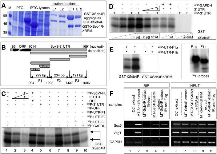 Fig. 3. Sox3 mRNA is a direct binding target of the RNA-binding protein XSeb4R. (A) SDS-PAGE electrophoregram of coomassie stained gel. XSeb4R and XSeb4RδRRM recombinant pGEX plamids were used to transform Bl21 bacterial cells. Cultures were induced (+ IPTG) or not (â IPTG) for 4 h, harvested and sonicated in PBS supplemented with protease inhibitors. GST-XSeb4R and GST-XSeb4δRRM were purified on glutathione affinty columns. The corresponding eluted fractions are indicated. (B) Schematic representation of Sox3 cDNA and the mutant constructs used in UV-crosslinking assays. Numbers indicate the nucleotide positions in the cDNA. (C) Electrophoregram of radioactive labeled GST-XSeb4R sample from UV-crosslinking. The two bands seen in purified proteins shown in A correspond to active GST-XSeb4R. As shown in lane 1, the full length (FL) Sox3 mRNA probe binds to GST-XSeb4R. Signal of this interaction was competed with cold probe from the 3â²UTR (lane 2, 1-to-1 and line 3, 1-to-10 molar ratio) but not from the ORF (lane 4, 1-to-10 molar ratio). Labeled probes from the 3â²UTR (lane 5) but not from the ORF (lane 6) bind to GST-XSeb4R. Probes from 3 adjacent F1, F2 and F3 3â²UTR show that F1 binds strongly compared to F2 and F3 (compare lane 7, 8, 9). A probe from GAPDH shows no significant interaction with GST-XSeb4R (lane 10). (D) The intensity of the 3â²UTR but not GAPDH signal is proportional to the amount of protein used. The signal of the highest protein quantity was competed by unlabeled 3â²UTR probe. GST-XSeb4RδRRM shows no interaction with the 3â²UTR probe. (E) Probe from the region spanning the F1b interacts with highest avidity to GST-XSeb4R. (F) Ribonucleic acid immuno-precipitation (RIP) coupled to RT-PCR shows that Sox3 and VegT mRNAs are enriched in XSeb4R-RNP complexes (F, lane 2). Unspecific interactions, proportional to the amount of target RNA in the samples, were revealed in control assays (F, lane 1, 4 and 5). The RT-PCR products were analyzed on 2.3% agarose gels.