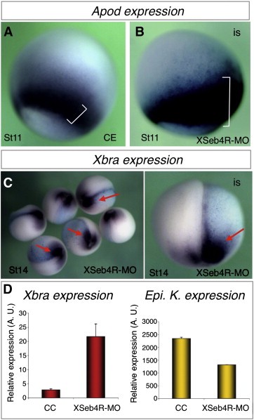 Fig. 6. XSeb4R regulates the levels and expression boundaries of mRNAs encoding germ layer specification markers. XSeb4R-MO was injected into the animal hemisphere of one blastomere of two- or four-cell stage albino embryos and the latter were analyzed by WMISH at gastrula and neurula stages, using the indicated probes. The control embryo (CE) shows a ring-like expression pattern around the blastopore and the width is indicated (A). The injected embryo, oriented vegetal pole down, revealed an upward expression expansion (46%, n = 60) in the presumptive ectoderm and the width is indicated (B). Xbra analysis in neurula stage morphant embryos revealed an expanded expression in 80% of the total embryos (n = 45). Caps from CE or from embryos injected with XSeb4R-MO in the four micromeres at 4/8-cell stage were analyzed by real-time RT-PCR targeting mesodermal marker Xbra and the ectodermal gene Epi. K. XSeb4R protein knockdown induces Xbra expression and a repression of Epi. K. expression (C). Data are expressed relative to GAPDH mRNA.