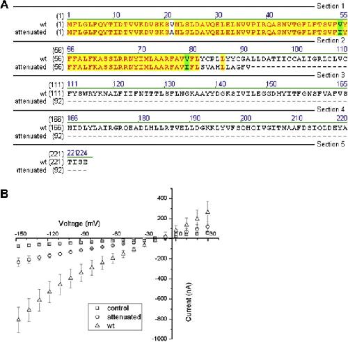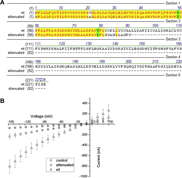 Fig. 4. The ORF3 gene of an attenuated-type PEDV encodes a truncated protein and shows less channel activity. (A) Sequence alignment of Vector NTI 9.0 with PEDV. (B) Current–voltage relationships of wild-type CV777 and attenuated-type PEDV ORF3 mediated ionic currents in oocytes by TEVC.