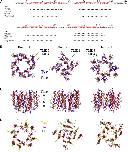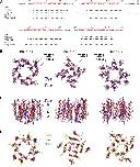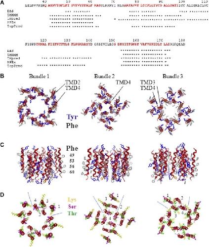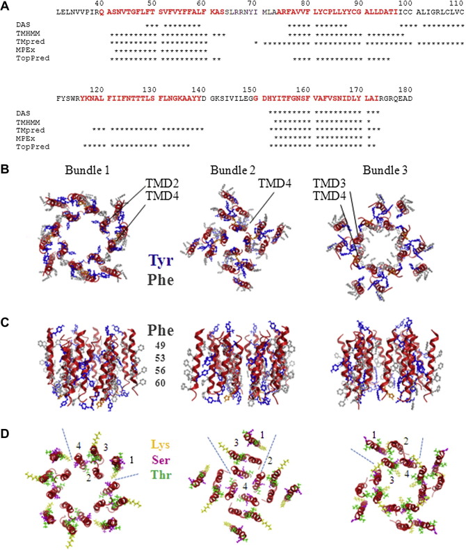 Figure 1. Structure prediction and computational modeling of PEDV OFR3 protein. Prediction of the transmembrane (TM) parts of ORF3 protein from porcine epidemic diarrhea virus (PEDV) CV777 using different secondary structure prediction programs (A). Residues highlighted in red reflect the consensus sequence and were used for molecular dynamics (MD) simulations and assembly. Representation of three PEDV ORF3 protein assemblies with the lowest potential energy on the left (B) and second (C) and third lowest models (D). View onto the bundle with tyrosines (blue) and phenylalanines (grey) highlighted (top row). Respective side views are shown in the middle panel. Top view of the bundles with Lysâ55 (yellow), serines (pink) and threonines (green) highlighted.