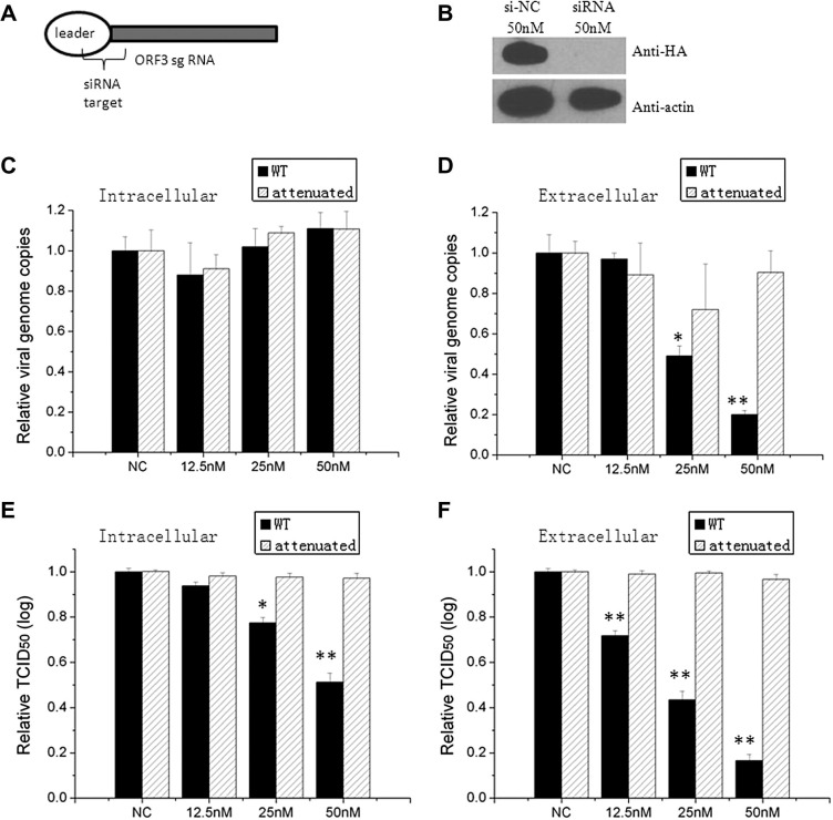Fig. 5. The virus production is reduced on knockdown of the ORF3 gene by siRNA. (A) Schematic diagram showing the design of siRNA for knockdown of specific PEDV ORF3 subgenomic mRNA. (B) The siRNA knockdown efficiency was checked by western blotting in PEDV ORF3 expression plasmid and siRNA cotransfected cells. (C, D) The relative virus yield is quantified by real-time RT-PCR, and also titered by TCID50 Assay (E, F). Fifty nanomolar unrelated control siRNA was used as negative control (NC), and the results from siRNA-pretreated cultures were compared with those from control transfectant (NC, defined as 100%). (∗P < 0.05, ∗∗P < 0.01, compared with NC).