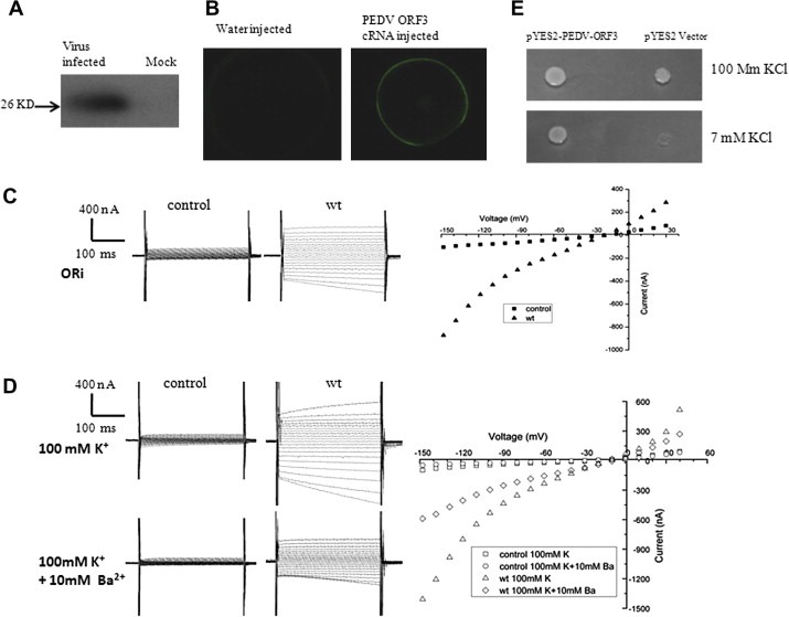 Fig. 2. The PEDV CV777 ORF3 protein forms an ion channel. (A) ORF3 protein was tested in PEDV infected cells by western blot. (B) Water-injected and PEDV ORF3-cRNA-injected oocytes are immunolabeled with anti-HA and monitored by confocal microscopy. (C) Typical current traces that can be detected by two-electrode voltage clamp (TEVC) in these PEDV CV777 ORF3 (wt) expressed oocytes, compared with water injected control oocytes. (D) PEDV CV777 ORF3 (wt) shows larger current in 100 mM K+ bath solution than in barium ions containing standard bath solution. (E) PEDV ORF3 channel can complement K+ channel deficient yeast. Growth phenotype of yeast Δtrk1Δtrk2 mutants transformed with PEDV CV777 ORF3 genes and pYES2 vector, respectively.