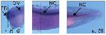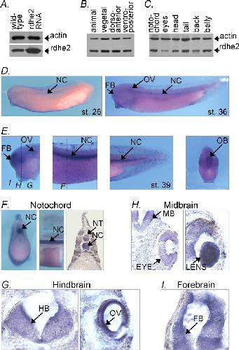 FIGURE 4. Expression pattern of endogenous rdhe2 in frog embryo. A, Western blot analysis of extracts (50 μg of total protein) of neurula stage wild-type embryos or embryos injected with in vitro synthesized rdhe2 mRNA revealing a single major band of the expected size (â¼34 kDa), which is increased in injected embryos, thus confirming that antibody is specific. B and C, Western blot analysis of dissected gastrula embryos (B) and stage 39 tadpoles (C), 30 μg of total protein per lane. D, whole mount in situ hybridization with antisense rdhe2 probe. E, in situ hybridization of dissected embryos with rdhe2 probe. Dashed lines indicate where embryos were cut in F. F, embryos stained with rdhe2 probe further dissected to better reveal staining of notochord (left, cross-section through the trunk; center, sagittal cut through the upper portion of the trunk), or paraffin-embedded and sectioned at 50 μm (right). G, 50-μm sections of prestained paraffin-embedded specimen revealing staining in the brain, eye, and otic vesicle. NC, notochord; NT, neural tube; FB, forebrain; MB, midbrain; HB, hindbrain, OV, otic vesicle; OB, olfactory bulb.
