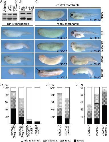 FIGURE 6. MO-mediated knockdown of endogenous rdhe2. A, Western blot analysis of protein extracts (30 μg/lane) from neurula embryos injected with 4 ng of rdhe2 mRNA alone or mixed with 50 ng of rdhe2 MO. MO essentially prevents an increase in the newly synthesized rdhe2 protein levels over those preexisting in wild-type embryos (bottom). Top, staining for β-actin as a loading control. B, Western blot analysis of protein extracts prepared from an equal number of rdhe2 and control morphants (st. 32) using rdhe2 (bottom) or actin (top) antibodies shows a decrease in endogenous rdhe2 levels. C, array of phenotypes displayed by rdhe2 and rdh10 morphants compared with control morphants. Phenotypes were divided into severe, strong, moderate, and mild groups with the representative embryos shown for each group. An arrow shows an incompletely closed neural tube typical for severely affected rdhe2 morphants. Dramatic phenotypic changes in morphants compared with the moderate decrease in protein levels in B may reflect a strong localized effect of MO at sites where newly synthesized rdhe2 protein is critical for embryogenesis. D, proportion of different phenotypic groups in rdhe2 morphants compared with control morphants and wild-type embryos. E, co-injection of rdhe2 rescue mRNA (4 ng) and rdhe2 MO (30 ng) decreasing the frequency and severity of defects displayed by morphants. F, proportion of different phenotypic groups in embryos injected with 25 ng of rdhe2 MO or rdh10 MO, or a mixture of both (50 ng total). Control MO (25 ng) was added to individual rdhe2- and rdh10-MO injections to equalize the total oligonucleotide amount.