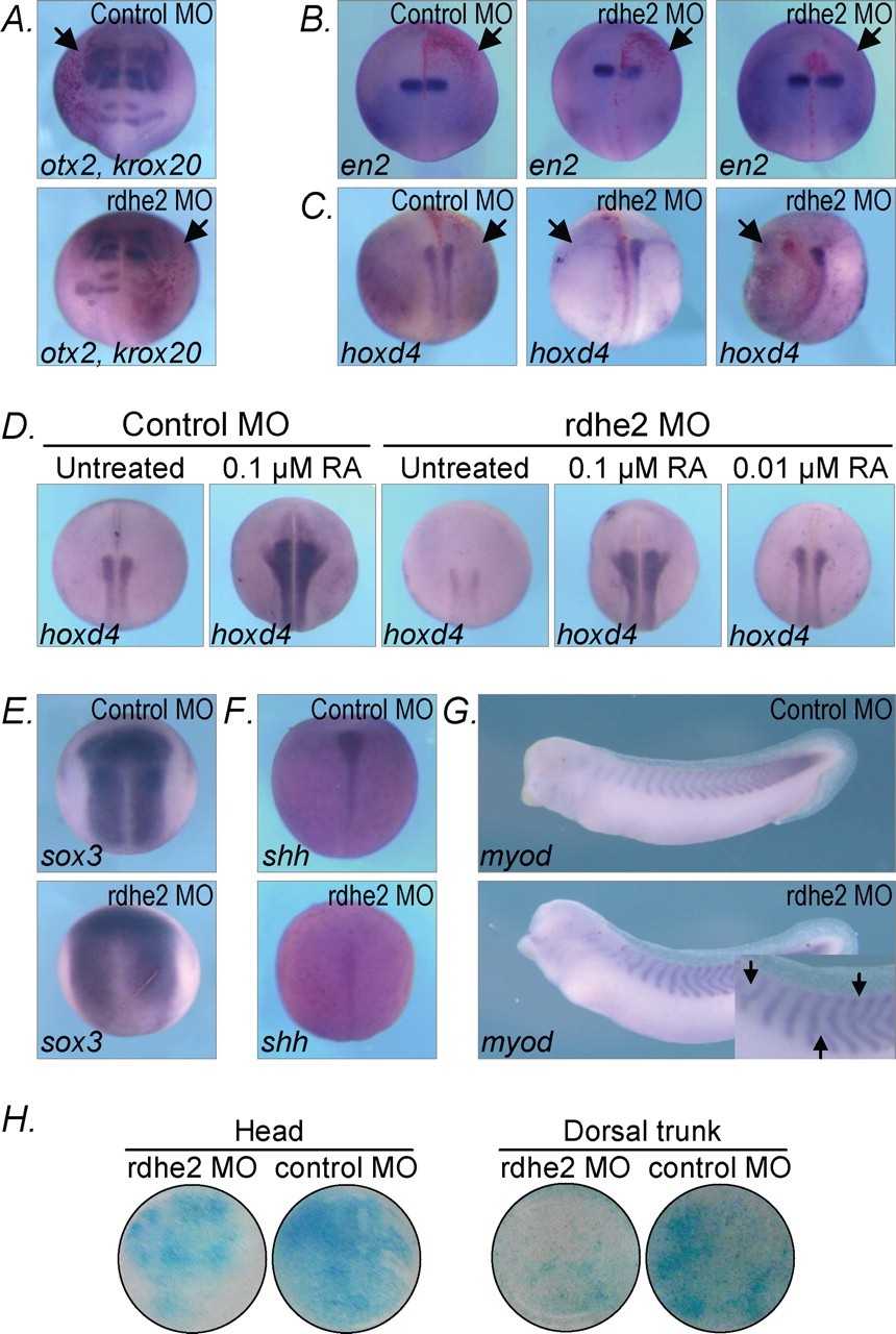 FIGURE 7. Decreased retinoid signaling in rdhe2 morphants. A, rdhe2- or control-MO (155 ng) mixed with the lineage tracer were injected into one dorsal blastomere at four-cell stage. The injected side is indicated by an arrow. D, rdhe2- or control-MO (50 ng/embryo) was injected into two dorsal blastomers. D, embryos were treated with 0.01 or 0.1 μM RA where specified. A, whole mount in situ hybridization with antisense RNA probes was performed for the following markers (stages and frequencies of observed phenotypes in parentheses): A, otx2 and krox20 (st. 20, 31/77); B, en2 (st. 189, 42/74); C and D, hoxd4 (st. 189, 30/46); E, sox3 (st. 134, 10/12); F, shh (st.14, 23/28); G, myod (st. 302, 15/42). Arrows in G indicate irregular somites as revealed by myod staining. H, tissues of rdhe2 and control morphants were incubated over the monolayer of F9-RARE-lacZ cells; β-galactosidase activity was revealed with X-gal substrate. The results are representative of three independent experiments.