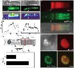 Figure 3. Quantification of transgene expression from dual rhodopsin cassettes in Xenopus rods.(a, b) Measurement of the EGFP and mCherry fluorescence distributions in cells expressing Rho-mCherry/Rho-EGFP (a) and Rho-mCherry-RhoP23H-EGFP (b). Control rods with no fluorescent protein had only background fluorescence which was set to zero. Images show the mCherry (red), EGFP (green) and merged distributions for representative rods. The merged image (a, right) shows synchronized changes in the expression level of both transgenes (Rho- EGFP and Rho-mCherry). The concentration of both proteins is comparable along the rod axis. (b) The RhoP23H-EGFP expression level is significantly lower (b, middle) than the co-expressed wild type Rho-mCherry (b, left). The inset in panel (b, middle) shows the intensified EGFP channel of the original figure to clarify its profile. (c, d) Distributions were measured along the central axis of the cell (white line), converted to concentration using the calibration in Fig. S3 and plotted as a function of distance from the OS base. The dual wild type cassettes are shown in (c) at the same scale for both green and red channels, while for the dual cassette containing RhoP23HEGFP (d), the EGFP values (green) are given on right Y-axis (green) and the mCherry values (red) on left Y-axis. The distance is measured from the base of the rod OS. The arrowhead indicates fluorescent foci in the RhoP23H-EGFP rod. Scale bar, 5 µm.