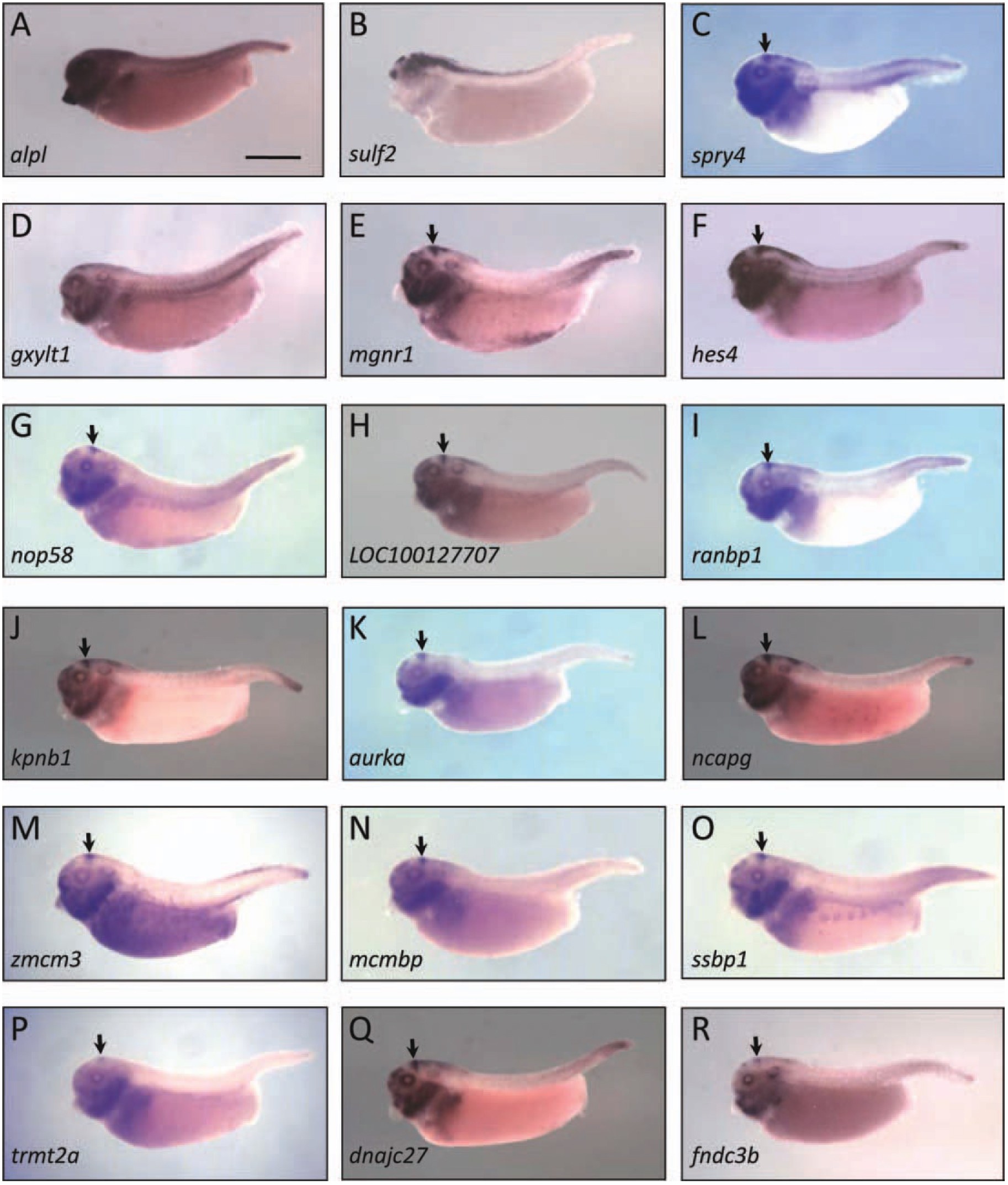 Genes referenced: adam23 alpl aurka col8a1 ddx39a dnajc27 egr3 fndc3b fuz galnt11 gpx3 gxylt1 hba-l5 hbz hes4 kpnb1 lurap1 mcm3 mcm3l mcmbp mgrn1 mhc1-uda mt-tr ncapg nop58 npm1 ppip5k1 prdx2 ptmap12 ranbp1 rgs3 slc1a2 spry4 ssbp1 sulf2 tbx2 tk1 tmem114 trmt2a trna tub usp21