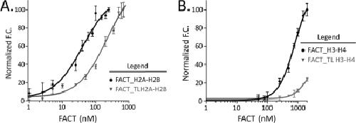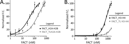 A shows the normalized fluorescence change upon titration of FACT (log [FACT]) into fluorescently labeled H2A-H2B and TL H2A-H2B. Fluorescence change (F.C.) occurs as a result of direct protein/protein interaction. A 7-fold decrease in affinity between FACT and H2A-H2B is observed when these basic extensions are removed from the histones (binding curve shifts right to higher FACT concentrations). B displays the binding curves for FACT with H3-H4 and TL H3-H4. FACT·H3-H4 binding occurs at high nanomolar concentrations, yet deletion of the N- and C-terminal tails pushes binding out of the nanomolar range. The error bars represent the standard error within individual data points. The total data points (N) for a single experiment are 12.