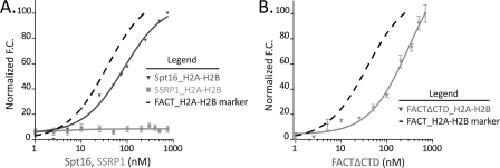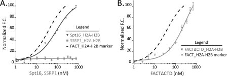 FIGURE 2. Spt16 subunit and its acidic C-terminal domain coordinate high affinity FACT interaction(s) with H2A-H2B.