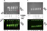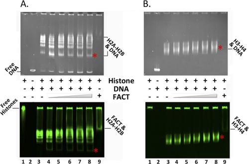 FIGURE 3. FACT competes with DNA for a shared interaction interface on H2A-H2B but cannot compete H3-H4 from DNA. Histones can readily bind DNA at physiological salt concentrations in vitro, as seen by native PAGE. The use of fluorescently labeled histones allows visualization by two distinct means (UV, top panels, to monitor DNA; and fluorescence scanning, bottom panels, to monitor histones). The H2A-H2B dimer forms many stable complexes with a 207-bp 601 sequence DNA construct (A). Incubation with H3-H4 will form a stable tetrasome where DNA is wrapped around a single (H3-H4)2 tetramer (B). The appearance of accumulating free DNA (top left panel, lanes 4–8) and a higher order band running similar to a preformed FACT·H2A-H2B complex (bottom left panel, lanes 6–8) confirms that FACT can compete H2A-H2B from DNA but cannot form a ternary complex with DNA-bound H2A-H2B. Right panels show that, in contrast, FACT cannot remove H3-H4 from DNA once bound. No evidence for free DNA, a FACT·H3-H4 complex, or ternary complex is observed upon FACT titration (B, lanes 4–8). Red asterisks are displayed next to the furthest running histone·DNA species to aid specific band comparisons between the UV and fluorescence gel images.