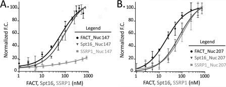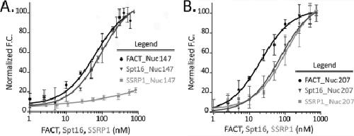 FIGURE 4. Linker DNA is required for high affinity interaction between SSRP1 and nucleosomes. Nuc147 lacks the symmetrical 30-bp linker DNA extensions of Nuc207. FACT and Spt16 can bind either form with high affinity (Kd(app) <100 nm). However, as seen in A, the SSRP1 subunit cannot bind the 147-bp nucleosome in the nanomolar range. However, SSRP1 binds Nuc207 with high affinity (B), which suggests that linker DNA is a target of SSRP1 binding. B also shows that both Spt16 and SSRP1 subunits together in complex are essential for achieving the highest affinity binding event with Nuc207. The error bars represent the standard error within individual data points. The total data points (N) for a single experiment are 12.
