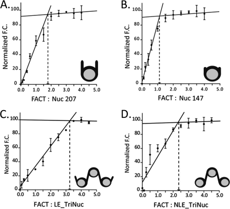 A–D show stoichiometry measurements for FACT with the Nuc207, Nuc147, and two distinct tri-nucleosome constructs. The tri-nucleosomes are labeled LE (linker ended), which contain 30-bp linker arms extending from the terminal nucleosomes, and NLE (non-linker ended), which lacks terminal linkers. To measure stoichiometries, the labeled probe ((tri)nucleosomes) was kept constant 5–10-fold over the measured Kd(app) so that any addition of FACT results in direct interaction. The fluorescence change deviates from linearity at the point of saturation. The presence of terminal linker DNA on the (tri)nucleosome (A and C) increases the stoichiometry compared with the Nuc147 and NLE tri-nucleosome. The error bars represent the standard error within individual data points. The total data points (N) for a single experiment are 12.