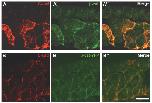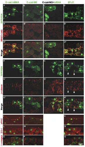 Fig. S2. Changes in expressions after injection of C-cadherin mRNA, C-cad-MO or EPDC mRNA. C-cadherin mRNA (C-cad, 500 pg/blastomere), C-cad-MO (10 ng/blastomere) or EPDC mRNA (500 pg/blastomere) was injected animally into two of 4 blastomeres (labeled by co-injection of GFP, b-gal mRNA or FDA). Embryos were fixed at stage 10.5, sectioned and immunostained with C-cadherin (A-D), b-catenin (E-H), aPKC (apical marker, I-K), ZO-1 (marker for tight junction, L-N) or b1-integrin (basolateral marker, O-Q) antibody. C-cadherin protein expression is increased by the mRNAs (A-A0,D-D0), and decreased by the morpholino (B-B0) which is rescued by C-cadherin mRNA (C-C0). b-catenin protein density at the membrane is increased by C-cadherin mRNA (E-E0), and decreased by C-cad-MO (F-F0) which is rescued by C-cadherin mRNA (G-G0). EPDC mRNA does not change b-catenin expression except at the boundary with normal cells where the signal is stronger (H-H0, arrowheads). Expression of aPKC, ZO-1 and b1-integrin proteins do not differ from unlabeled control cells, indicating that epithelial polarity is not affected by modulation of C-cadherin expression. Apical to the top. Scale bar: 20 um.
