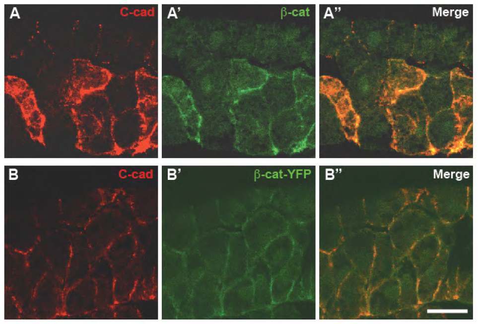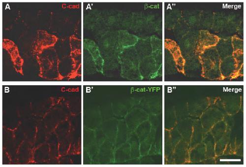 Fig. S3. Localization and density of C-cadherin coincide with that of b-catenin. (A-A0) Ectoderm expressing C-cadherin mRNA in a mosaic fashion was double-stained with anti-C-cadherin and anti-b-catenin antibody. (B-B0) b-catenin-YFP expressed in ectoderm cells was detected with anti-GFP antibody, in addition to C-cadherin. In both cases, expression of b-catenin follows that of C-cadherin. Apical to the top. Scale bar: 20 um.