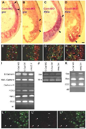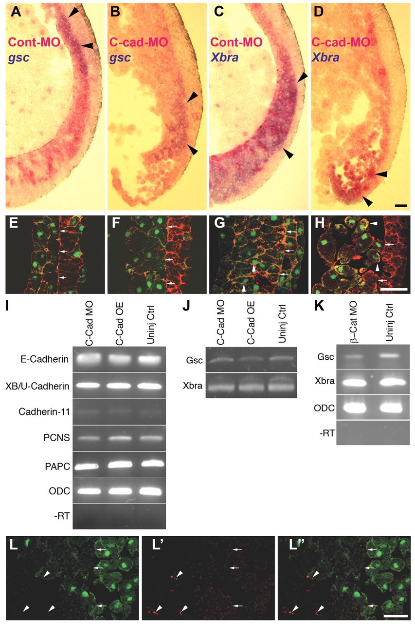 Fig.1. Effects of C-cad-MO. (AâH) Late gastrula sagittal sections, after dorsovegetal injection of control MO or C-cad-MO (40 ng/embryo). (AâD) In situ hybridization. gsc-expressing anterior mesoderm (arrowheads, A,B, dark purple); Xbra-expressing chordamesoderm (arrowheads, C,D). Injected cells, magenta. (EâH) High magnification, injected mesoderm cells (green) counterstained for actin (red). Brachet's cleft (arrows) separates mesoderm (left) and ectoderm (right). Tightly packed cells in control MO (E) and C-cad-MO (F) anterior mesoderm. Chordamesoderm cells are spindle-shaped in controls (arrowheads, G), but rounded in C-cad-MO embryos (arrowheads, H). (I) RT-PCR for cadherins and protocadherins in embryos injected with C-cad-MO (40 ng) or C-cadherin mRNA (2 ng). (J,K) RT-PCR to show gsc and Xbra expression after C-cad-MO or C-cadherin mRNA (J) or β-catenin MO (K; 6 ng/embryo) injection. (LâLâ²) β-catenin membrane localization is reduced by C-cad-MO (10 ng) in anterior mesoderm. β-catenin staining (Lâ², red, arrowheads) in C-cad-MO cells co-injected with GFP mRNA (L, green; Lâ², merged). Anterior mesoderm is to the left of Brachet's cleft (arrows). Scale bars: 50 μm.