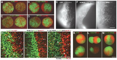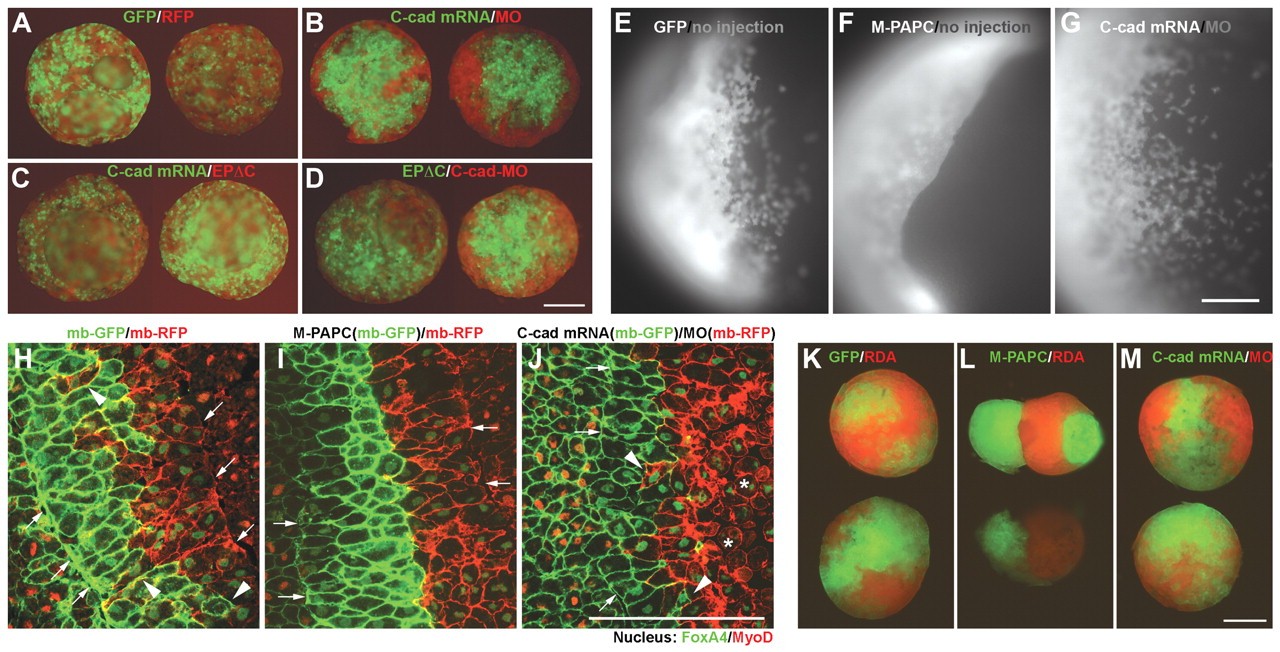 Fig.3. Cadherin expression and sorting. (AâD) Mixed and reaggregated ectoderm cells at the neurula stage. C-cad-MO (10 ng/embryo) cells sort from C-cadherin or EPδC cells (B,D); C-cadherin and EPδC cells do not segregate (C), similar to controls (A). (EâG) Ventral ectoderm C-cadherin and C-cad-MO cells do not segregate in vivo (G), similar to controls (E); M-PAPC-injected cells separate from normal cells (F). (HâJ) Chordamesoderm cell intercalation in the late gastrula. C-cadherin and C-cad-MO cells intercalate (J, arrowheads) as in controls (H, arrowheads). C-cad-MO cells are abnormally round (asterisk). Intercalation does not occur between M-PAPC-expressing and uninjected tissue (I). Nuclei were immunostained with FoxA4 (chordamesoderm) and MyoD (paraxial mesoderm) antibodies. Arrows indicate the notochordâsomite boundary. (KâM) Explantation does not induce sorting. Inner ectoderm isolated from early gastrulae, cultured to the neurula stage. The C-cadherinâC-cad-MO boundary (M) resembles that of the negative (K), rather than positive (MâPAPC injection, L) control. Scale bars: 200 μm.