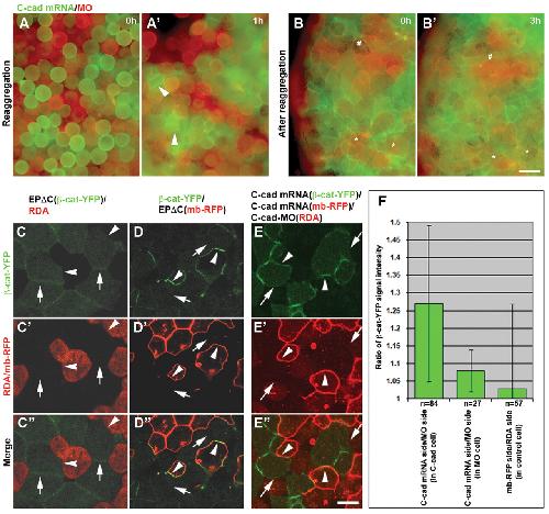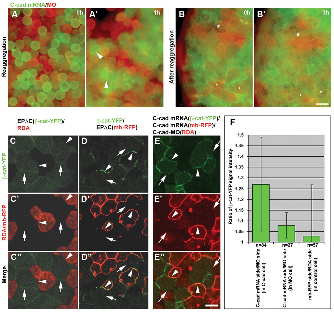 Fig.4. Cellular response to cadherin modulation. (AâBâ²) C-cad-MO (10 ng/embryo) and C-cadherin cells segregate during reaggregation (A,Aâ²), but not afterwards (B,Bâ²). (A) C-cadherin cells (green) establish early contacts (arrowheads, Aâ²), MO cells (red) remain round (Aâ²). (B,Bâ²) Random cell rearrangements, for example, deep C-cadherin cell moves to the surface (#) and surface C-cad-MO cells move inside (*), contrary to what would be expected from continued sorting. (CâF) β-catâYFP at the cell membrane varies with the amount of C-cadherin in adjacent cells. (CâDâ²) EPδC cells increase β-catenin when adjacent to normal cells (DâDâ², arrowheads and arrows), but not when adjacent to EPδC cells (CâCâ², arrowheads and arrows). (EâEâ²) In C-cadherin cells,β-catenin is more prominent at contacts with like cells (mb-RFP, arrowheads) than at those with C-cad-MO cells (RDA, arrows). Scale bars: 50 μm (Bâ²), 20 μm (Eâ²). (F) Quantification of β-catenin localization. Average pixel intensity was measured, and the ratio of intensities at contacts to high and to low cadherin cells was calculated for single cells for C-cadherin (left) and C-cad-MO (middle) cells. Ratio in controls shows no preference for sides (right). Left and middle bar, ratios significantly >1 (P<0.0001).