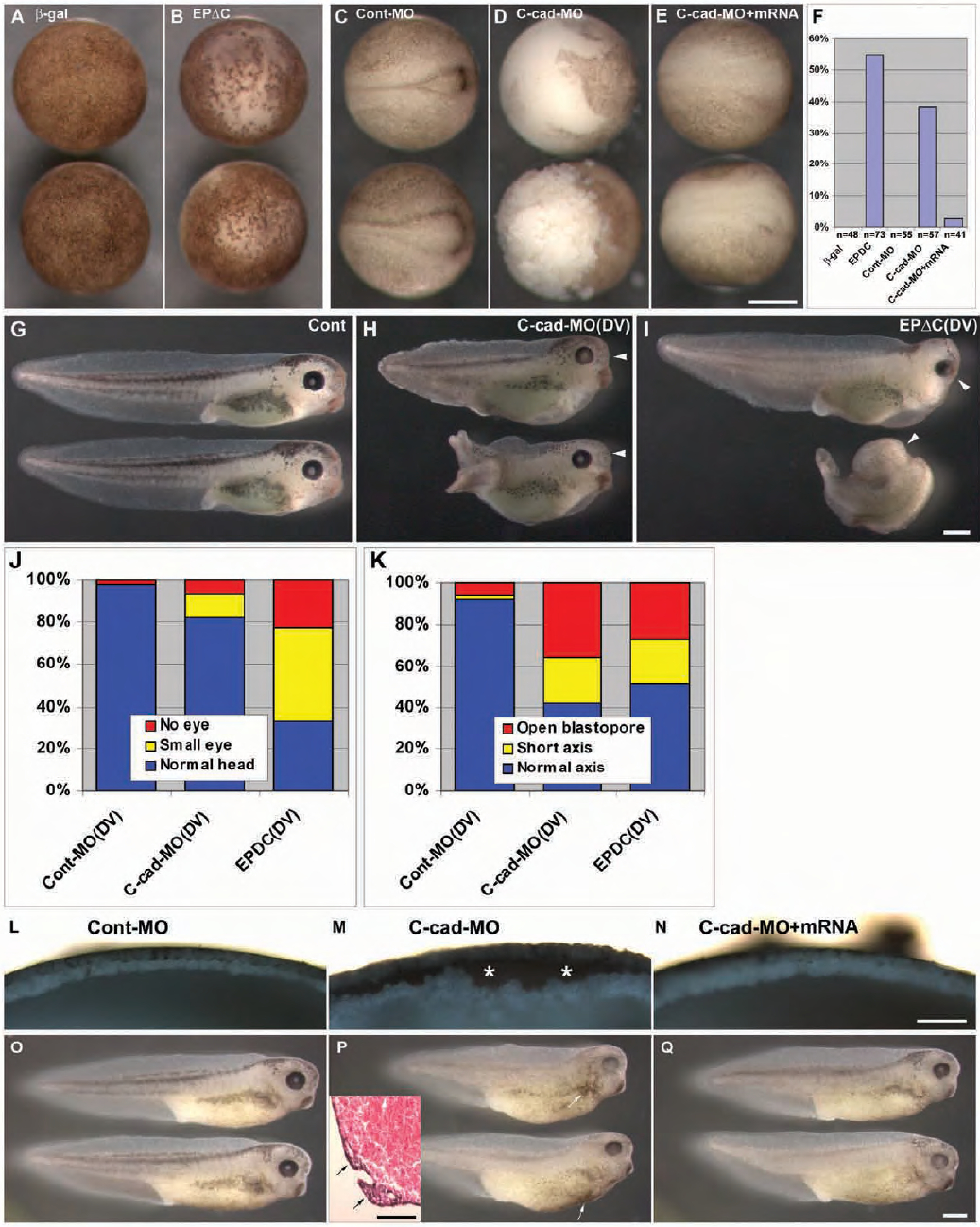 Fig. S1. Embryonic phenotype produced by C-cad-MO or EPDC. (A-F) Disintegration of embryos. Animal views of midgastrula (A,B) or neurula (C-E) embryos. Disintegration is seen after injection with EPDC mRNA (4 ng; B) or C-cad-MO (40 ng/embryo; D). (F) Fraction of disintegrated embryos. Effect of C-cad MO is rescued by C-cad mRNA (1 ng/embryo), although development remains delayed (E,F). (G-K) Head and axis formation in tailbud embryos after injection into dorsal mesoderm region. C-cad-MO (40 ng/embryo) or EPDC (0.5ng/blastomere) was injected into 8-cell dorso-vegetal blastomeres, which are fated for anterior mesendoderm, responsible for head induction, and for some posterior mesoderm engaged in axis formation. While EPDC injection inhibits head formation (arrowheads in I) with or without axis shortening, C-cad-MO injection reduces axis extension, but not head formation (arrowheads in H). (J) Rates of axis extension defect. (K) Rates of head defect, as seen from defective eye formation. (L-Q) Epithelial layer of ectoderm separates from inner layer at low dose of C-cad-MO. (L-N) Ectoderm in the gastrula (stage 11). Low level of C-cad-MO (10 ng/embryo) causes separation of outer and inner ectoderm layer (M, asterisks). (O-Q) This shows later as a tuft of wrinkled epithelium (arrows in P, inset shows histological section). Phenotypes were rescued by C-cadherin mRNA injection (N,Q). Scale bars: 500 um in E,G and Q, 100 um in N and P (inset).