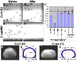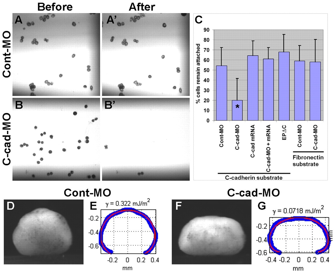 Fig.2. Adhesiveness of ectoderm cells. (AâC) Cells on C-cadherin-Fc substratum before and after dish inversion: (A,Aâ²) control MO-injected cells; (B,Bâ²) C-cad-MO cells (10 ng/embryo); (C) fraction of cells remaining attached. *Ratio significantly different from control condition (P<0.05). (DâG) Surface tensions of ectoderm. (D,F) Side view of aggregates after 2 hours. (E,G) Drop shapes (red lines) were fitted to scanned outlines of aggregates (blue) by axisymmetric drop shape analysis (ADSA). (D,E) Control; (F,G) C-cad-MO aggregates.