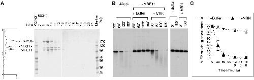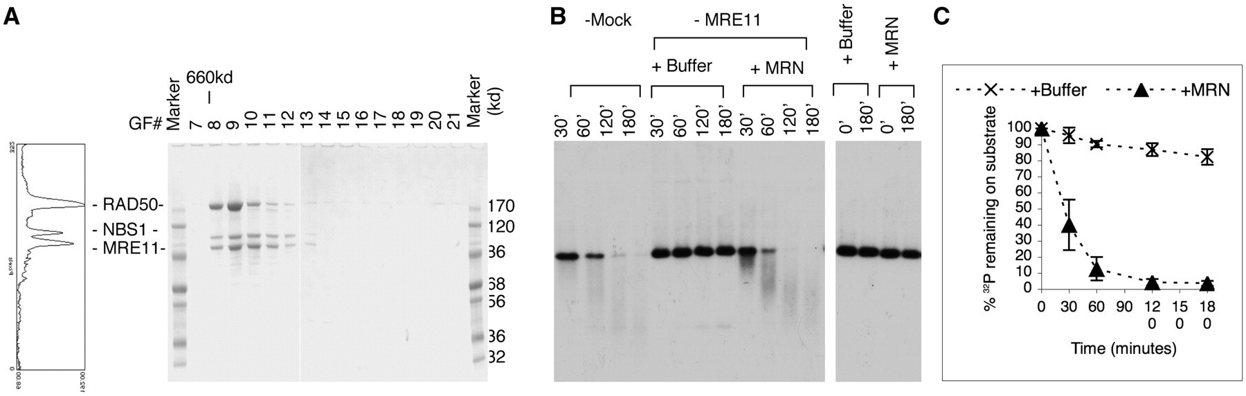 Complementation of MRE11 depletion by the purified MRN protein. (A) A SDS-PAGE showing the final gel-filtration fractions of the purified Xenopus MRN complex. The gel was stained with Coomassie blue and the staining intensity of fraction #9 was plotted. (B) Complementation of MRE11 depletion with the purified MRN complex. The 3â²-labeled linear pBLP DNA substrate was incubated in the MRE11-depleted cytosol supplemented with MRN or buffer. Samples taken at the indicated times were analyzed as in Figure 1C. (C) Plot of the complementation assays. The 3â²-32P on the remaining substrate DNA at the indicated times from three experiments were used to calculate the averages and standard deviations.