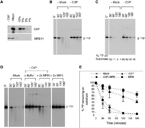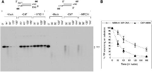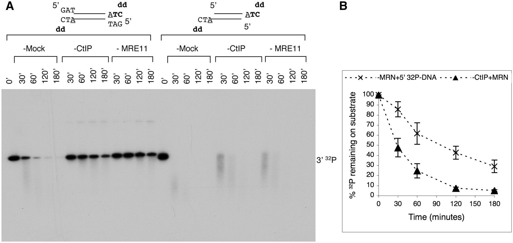 MRE11 and CtIP can be bypassed by a 3â²-ss-tail. (A) 3â²-labeled DNA (at the underlined nucleotide), either blunt ended or with a 3â²-ss-tail was incubated with the indicated depleted cytosol. Samples taken at the indicated times were analyzed by TAE-agarose and the products were detected by exposure to an X-ray film. (B) Plot of the kinetics of 5â²-32P removal by the purified MRN (2x) and the kinetics of 3â²-labeled DNA degradation in the CtIP-depleted cytosol supplemented with MRN (2x). Three sets of data were used to calculate the averages and standard deviations.