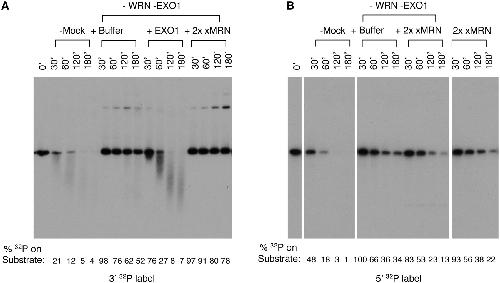 Excess MRN cannot bypass WRN and EXO1. (A) Effect of excess MRN on 5â²-strand processing in WRN and EXO1 co-depleted cytosol. The 3â²-32P-labeled pBLP DNA with ddC-blocked ends (1âng/ul) was incubated in the mock-depleted cytosol or WRN and EXO1 co-depleted cytosol [supplemented with buffer, EXO1 or MRN (2x)]. Samples taken at the indicated times were treated with SDS/proteinase K and analyzed on a 1% TAE-agarose gel. (B) Effect of excess MRN on the removal of the 5â²-32P label in WRN and EXO1 co-depleted cytosol. 5â²-labeled pBLP (1âng/ul) was incubated in mock-depleted cytosol or WRN and EXO1 co-depleted cytosol (supplemented with buffer or 2x MRN). Samples were treated and analyzed similarly to that in A.
