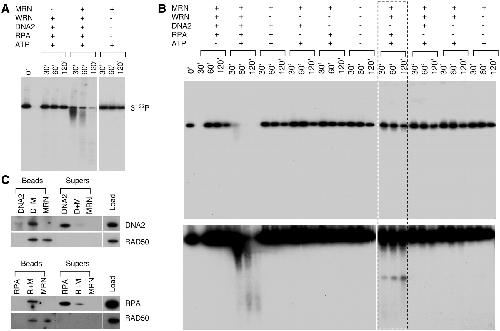 Purified MRN, WRN, DNA2 and RPA are sufficient to reconstitute 5â²-strand resection. (A) MRN stimulated the activity of WRN-DNA2-RPA towards blunt-ended DNA. WRN, DNA2 and RPA were incubated with 3â²-labeled DNA in the presence or absence of MRN. Samples taken at the indicated times were separated on a 1% TAE-agarose and the products were detected by exposure to an X-ray film. (B) The effect of each component on the reconstituted MRN-WRN-DNA2-RPA pathway. Various combinations of proteins and ATP were incubated with the 3â²-labeled blunt-ended DNA. Samples taken at the indicated times were analyzed similarly to those in A. A long exposure was also presented to show the faint products. (C) Interactions of MRN with DNA2 and RPA. MRN was incubated with DNA2 or RPA and then immunoprecipitated by anti-MRN antibodies. The beads and supernatants were analyzed by Western blot with antibodies against DNA2, RPA, and RAD50.