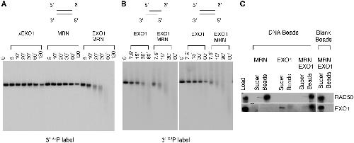MRN stimulates the activity of EXO1. (A) EXO1 and MRN, alone or together, were incubated with 3â²-32P labeled blunt-ended DNA. Samples taken at the indicated times were separated on a 1% TAE-agarose and the products were detected by exposure to an X-ray film. (B) EXO1 and MRN, alone or together, were incubated with 3â²-labeled DNA with a 3â²-overhang (ca. 200-300ânt). Samples taken at the indicated times were separated on a 1% TAE-agarose and the products were detected by exposure to an X-ray film. (C) MRN helps recruit EXO1 to DNA ends. EXO1 and MRN, alone or together, were incubated with 1.5âkb DNA anchored via biotin at one end onto Streptavidin magnetic beads. A reaction with EXO1, MRN and blank beads was also set up as a control. The beads and supernatant fractions were analyzed for EXO1 and RAD50 by Western blot analysis.