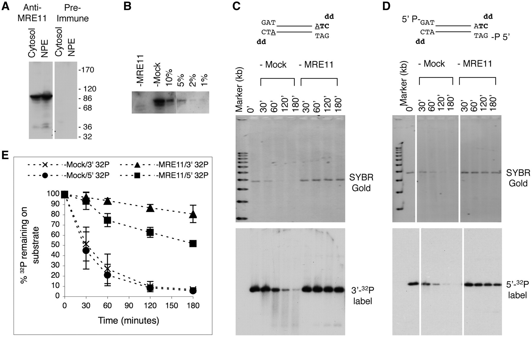 Depletion of MRE11 blocks 5â²-strand resection. (A) Detection of MRE11 in cytosol and NPE by Western blot with anti-Xenopus MRE11 antibodies. (B) Efficiency of MRE11 depletion from cytosol. The standards for quantitation were cytosol loaded at different amounts relative to the depleted cytosol. (C) Effect of MRE11 depletion on 5â²-strand resection. 3â²-32P-labeled (at the underlined A) linear pBLP DNA with ddC-blocked ends (1âng/ul) was incubated in the MRE11-depleted or mock-depleted cytosol. Samples were taken at the indicated times, treated with SDS/proteinase K and separated on a 1% TAE/agarose gel. The gel was first stained with SYBR Gold and then dried for exposure to an X-ray film. (D) Effect of MRE11 depletion on the initiation of 5â²-strand processing. The 5â²-32P-labeled linear pBLP DNA with ddC-blocked ends (1âng/ul) was incubated with the MRE11-depleted or mock-depleted cytosol. Samples taken at the indicated times were analyzed as in (C). (E) Plot of the amounts of 3â²- and 5â²-32P on the remaining substrates at the indicated times after incubation in the MRE11-depleted or mock-depleted extracts. The averages and standard deviations were calculated with three sets of data.
