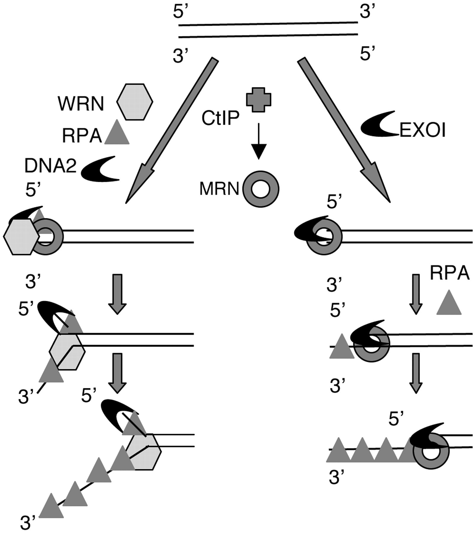 Model for the two pathways of 5â²-strand resection. MRN is directly involved in the initiation of resection while CtIP stimulates the activity of MRN. The other resection proteins are involved in both the initiation step and the extension step.