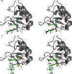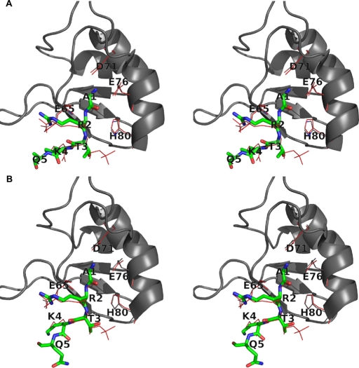 FIGURE 2:. Survivin interacts with the unmodified H3 tail in similar way as with H3T3ph. (A) Superposition of the crystal structure of wild-type Survivin with H3T3ph(1-4) (red lines) on the structure of wild-type Survivin (gray; cartoon representation) with H3(1-12) peptide (green in stick representation). For clarity, only D71, D76, H80, E65, and both peptides are shown in line or stick representation. Figures are in stereo representation. (B) Superposition of the crystal structure of wild-type Survivin with H3T3ph(1-4) (red lines) on the structure of K62A Survivin (gray; cartoon representation) with H3(1-12) peptide (green in stick representation). For clarity only, D71, D76, H80, E65, and both peptides are shown in line or stick representation. T3 Oγ can form a weak hydrogen bond with the H80 side chain if present in the modeled orientation. Alternatively, the hydrophobic interactions between T3 Cγ and Survivin may be formed if T3 adopts a different orientation (not shown). Determination of the prevailing orientation of T3 was not possible due to the low quality of its corresponding electron density. Figures are in stereo representation.