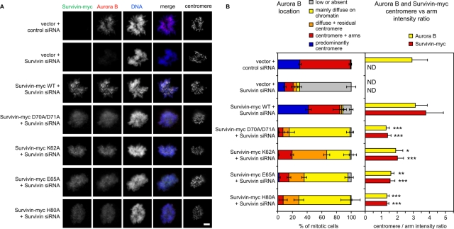 FIGURE 3:. Chromosomal passenger complex delocalization in prometaphase in cells expressing mutant Survivin-myc proteins and depleted of endogenous Survivin by siRNA treatment. (A) HeLa cells stably expressing vector alone or Survivin-myc containing the indicated mutations were transfected with siRNA as shown, synchronized by double thymidine block and then released into fresh medium for 12 h, followed by immunostaining with anti–myc epitope antibody (green), anti–Aurora B antibody (red), and ACA. Scale bar, 5 μm. (B) For cells treated as in A, Aurora B localization classified by immunofluorescence microscopy in ∼100 cells in each condition is shown on the left. Means ± SD (n = 3). Right, the ratio of centromere to chromosome arm fluorescence intensity for Aurora B and Survivin-myc. Means ± SD (n = 5). ***p < 0.001, **p < 0.01, *p < 0.05 compared with cells expressing Survivin-myc WT by one-way analysis of variance followed by Bonferroni's multiple comparison test. ND, not determined.