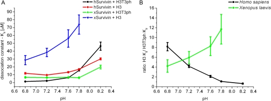 FIGURE 5:. pH dependence of histone-binding affinity and phosphospecificity of class A and class B Survivins. (A) Differences in affinity of Survivin class A and class B toward H3T3ph(1-12) and H3(1-12) peptides depending on pH changes. Survivin class A is represented by hSurvivin, and Survivin class B is represented by xSurvivin. (B) Differences in phosphospecificity between Survivin class A (Homo sapiens) and class B (X. laevis) within pH range 6.8–8.2. Phosphospecificity is displayed as a ratio of the Survivin affinity to H3T3ph peptide to the affinity to H3 peptide, (1/KdH3T3ph)/(1/KdH3).