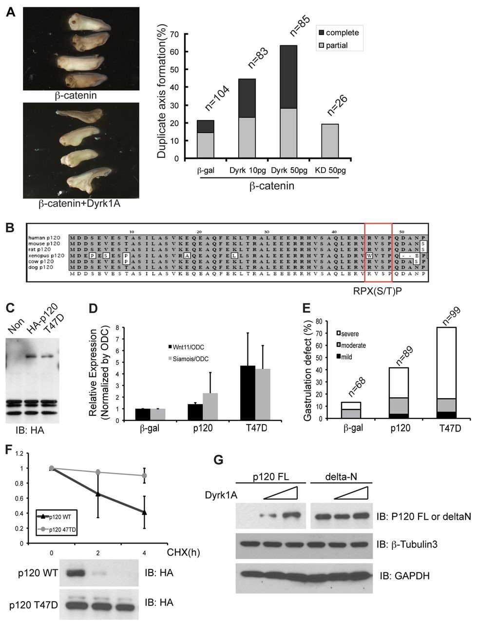 The Wnt pathways contribute to many processes in cancer and development, with β-catenin being a key canonical component. p120-catenin, which is structurally similar to β-catenin, regulates the expression of certain Wnt target genes, relieving repression conferred by the POZ- and zinc-finger-domain-containing transcription factor Kaiso. We have identified the kinase Dyrk1A as a component of the p120-catenin-Kaiso trajectory of the Wnt pathway. Using rescue and other approaches in Xenopus laevis embryos and mammalian cells, we found that Dyrk1A positively and selectively modulates p120-catenin protein levels, thus having an impact on p120-catenin and Kaiso (and canonical Wnt) gene targets such as siamois and wnt11. The Dyrk1A gene resides within the Down's syndrome critical region, which is amplified in Down's syndrome. A consensus Dyrk phosphorylation site in p120-catenin was identified, with a mutant mimicking phosphorylation exhibiting the predicted enhanced capacity to promote endogenous Wnt-11 and Siamois expression, and gastrulation defects. In summary, we report the biochemical and functional relationship of Dyrk1A with the p120-catenin-Kaiso signaling trajectory, with a linkage to canonical Wnt target genes. Conceivably, this work might also prove relevant to understanding the contribution of Dyrk1A dosage imbalance in Down's syndrome.