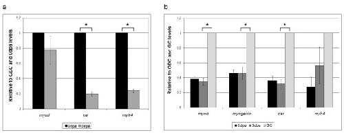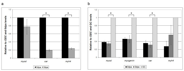 Figure 4. Expression of mature muscle genes decreases with regeneration in tail and limb. (a) Real Time PCR analysis of tail regeneration. myod gene expression does not significantly change in the distal stump between 0 and 3 dpa, while cardiac α actin (car) and myosin heavy chain 4 (myh4) have 5-fold lower expression at 3 dpa. n = three independent experiments of 10 tail samples per time point. (b) Real Time PCR analysis of stage 54 limb regeneration. Three samples were used: 0 dpa zeugopod; 3 dpa zeugopod; growth control (GC)-not amputated, three days older zeugopod. myod, myogenin and car levels are the same between 0 and 3 dpa. However, comparing 3 dpa with GC, we observed a significant lower expression of myod, myogenin and car in the regenerating limb. n = four independent experiments of 10 or 20 limb samples per time point. Results were normalized for ornithine decarboxylase (odc) expression and relativized to the time points with highest expression (0 dpa for tail and GC for limb). Error bars: standard error. Asterisk: p value < 0.01; Student's t test.