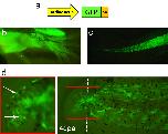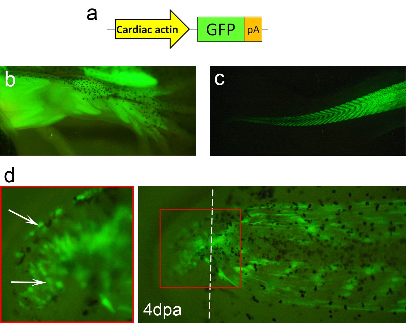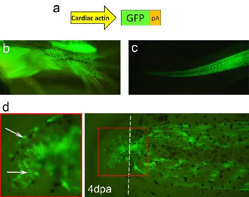 Figure 1. Alpha-cardiac actin promoter drives muscle specific expression. (a) Representation of the Car-GFP construct, where the muscle specific "alpha-cardiac actin" promoter (Car) is driving the expression of GFP. (b, c) Car-GFP F0 transgenic animals generally show specific and strong GFP expression in muscle fibres of the hindlimbs (b) and the tail (c). n = 25 animals. (d) At 4 dpa, many GFP+ cells are observed in the tail regenerate of a Car-GFP F0 transgenic tadpole (arrows). Dashed line: amputation plane.