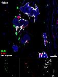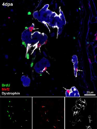 Figure 6. Dedifferentiating myofibres do not enter the cell cycle. 4 dpa regenerating tails were fixed 24 hours after intraperitoneal injection of BrdU and immunostained against BrdU (green), Mef2 (red, marking the nuclei of myoblasts and myofibres) and Dystrophin (white, marking the cell membrane of the myofibres). Dedifferentiating myofibres-the ones with irregular shapes-never showed myonuclei positive for BrdU (arrows; n = 100 myonuclei (Mef2+ nuclei inside the dystrophin)).
