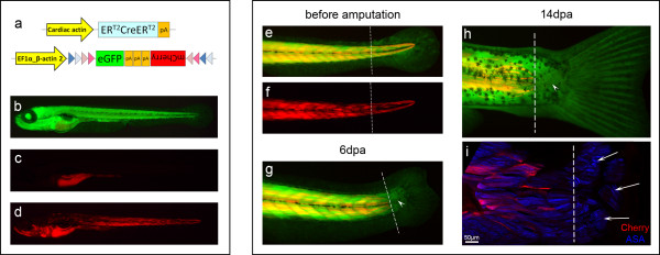 Figure 8. Labelled myofibres do not contribute to new muscle during regeneration of zebrafish larvae tail. (a) Representation of the Car-ERCreER and eab2-EGFPTmCherry [52] constructs, which allow the expression of mCherry in muscle fibres after activation of Cre. (b) These transgenics expressed eGFP ubiquitously. (c) Without tamoxifen treatment, mCherry expression was not observed (gut is autofluorescent). (d) After tamoxifen treatment, mCherry was generally visible in many muscle fibres. (e, f) Tails of two weeks old zebrafish larvae were amputated proximal to the base of the fin fold. (g) Six days later, some animals had regenerated a small piece of tail (arrowhead) and a caudal fin. (h) At 14 dpa, the small tail regenerate (arrowhead) continued to be free of mCherry labelling. (i) Confocal image of the same region, showing that the small tail regenerate has muscle fibres (arrows, ASA: α-sarcomeric actin) that are not labelled with mCherry. Pictures e to i correspond to the same animal. Dashed line: amputation plane. n = 33.