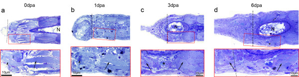 Figure 9. Zebrafish larvae show no muscle dedifferentiation phenotype. Micrographs from semithin sections showed that larval tail myofibres have a well organized sarcomeric structure that do not show signs of dedifferentiation during regeneration (arrows). (a, b) At 0 dpa and 1 dpa, distal most fibres show altered sarcomeric striations, characteristic of damaged or dying myofibre (arrowheads). (c) At 3 dpa this phenotype was not observed (neither at 2 dpa, not shown), instead, less muscle is observed close to the amputation plane (asterisk). (d) At 6 dpa, new myofibres are visible in the regenerate (left arrow). Notochord (N) is visible as an oval at 3 and 6 dpa because of the slight dorsal curvature that regenerating tails acquire (see Figure 8h). Dashed lines: amputation planes. n ≥ four sections per animal, three animals per time point.
